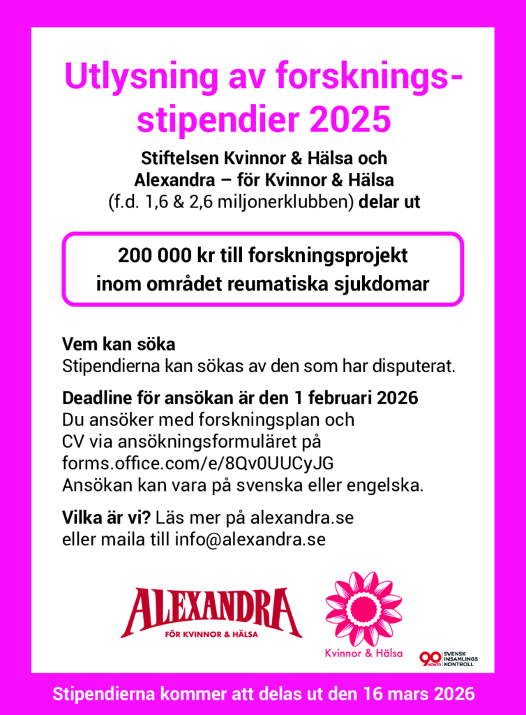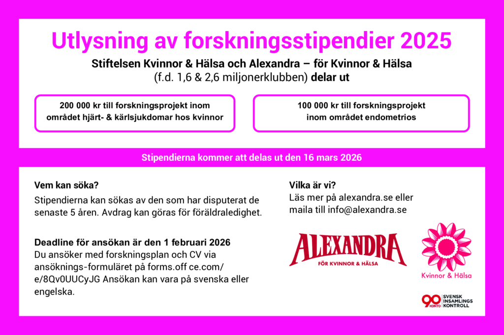 Nu är ansökningsperioden för 2026 års stipendier öppen. Vi delar ut stipendier för forskning inom tre områden: hjärtkärlsjukdom hos kvinnor, reumatiska sjukdomar hos kvinnor (nytt för i år!) samt för forskning inom området endometrios. Stipendierna kan sökas av den som har disputerat de senaste 5 åren.